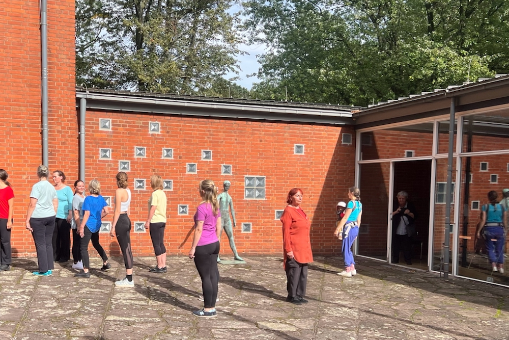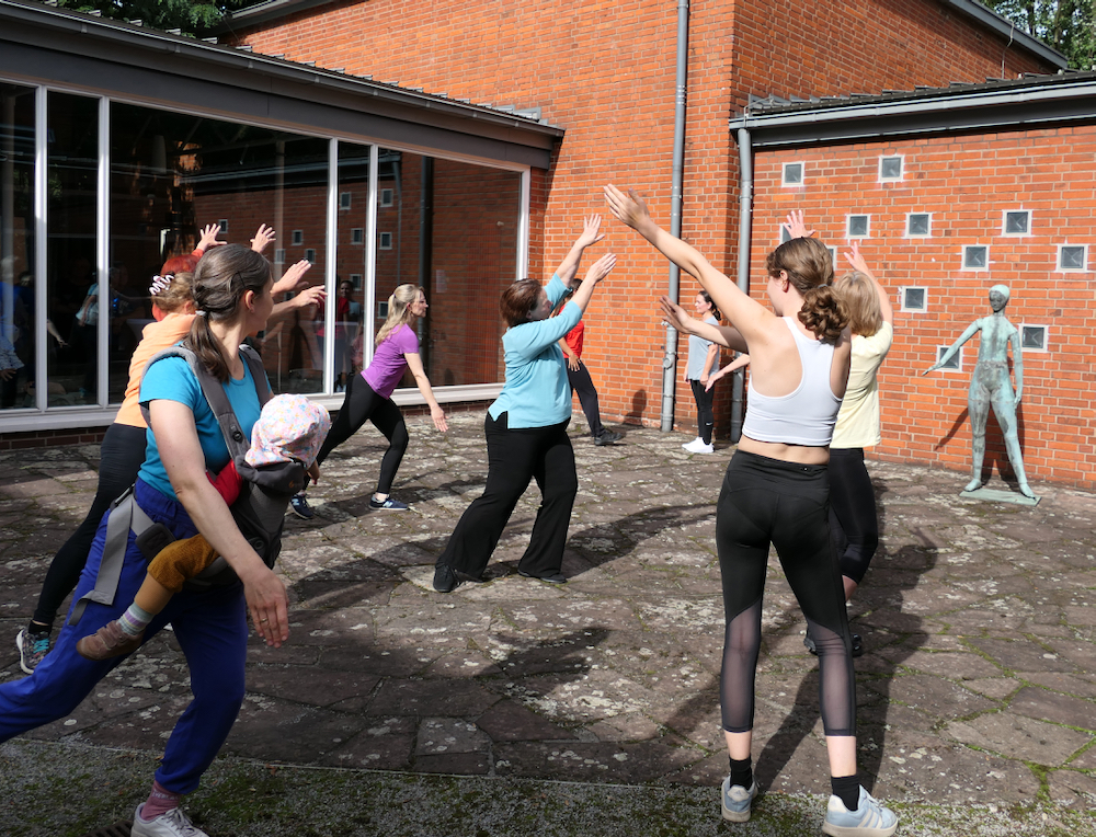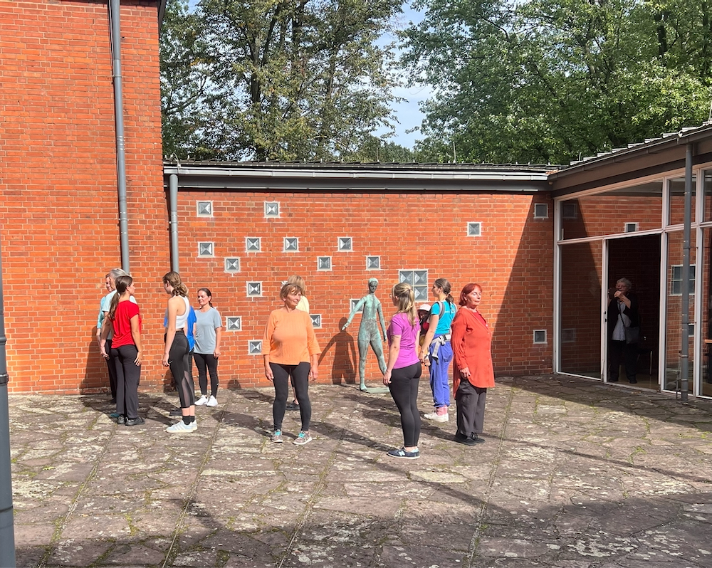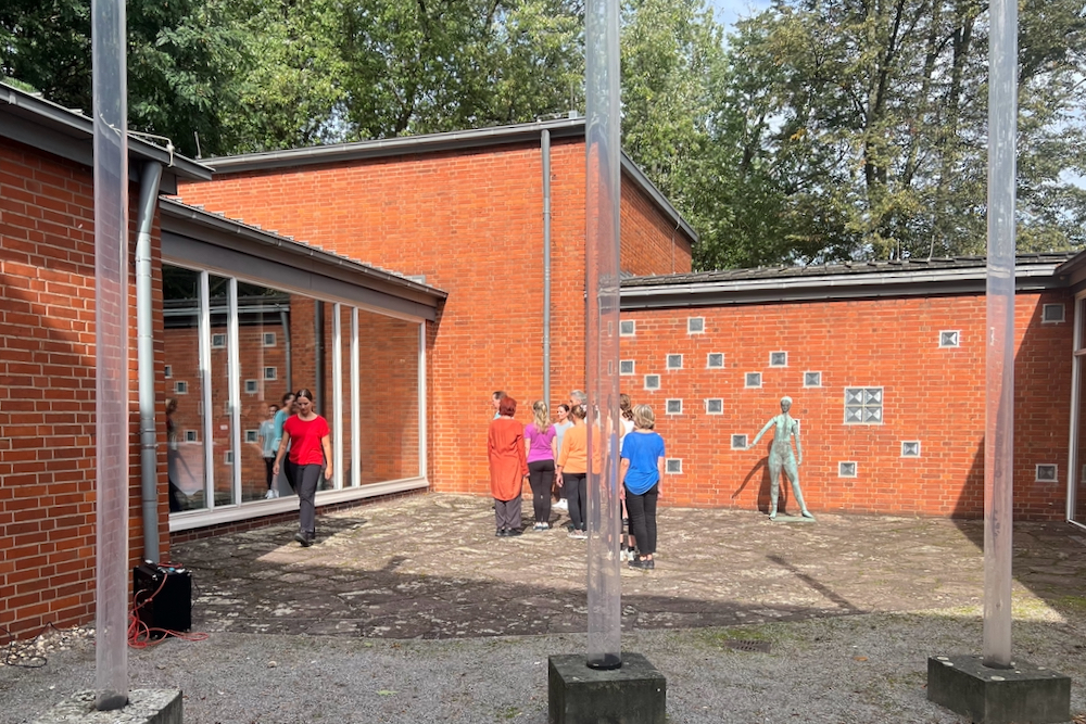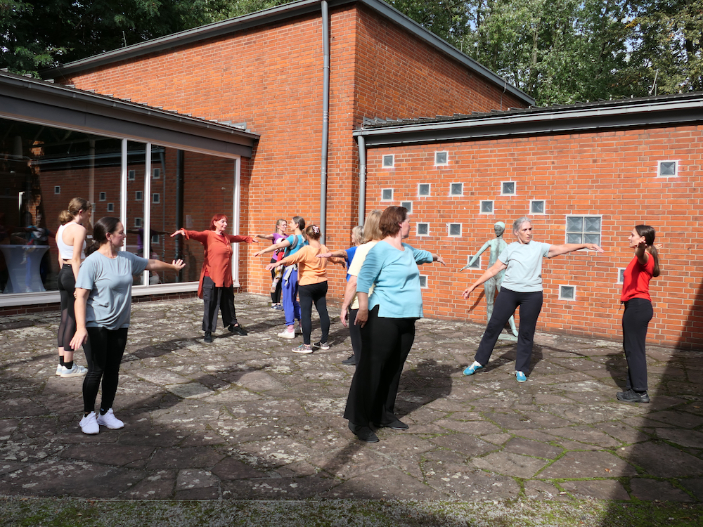 Recht ungewöhnlich war der Ort des Geschehens beim Sommerfest, denn getanzt wurde im Innenhof des Grimme-Instituts! Umrahmt von Skulpturen und den Mauern des denkmalgeschützten Gebäudes präsentierten die Tänzerinnen das Intro sowie vier der 52 Tanzfiguren des Stückes. Besonders sehenswert: ein „Junges Mädchen“, das am Rande des Geschehens durchgehend in seiner Position verharrte, quasi einer Ruhe-Geste aus der Tanzfigur Hug. Schon 1955 war sie aus Kupfer gegossen worden, vom KünstlerJoseph Jaekel.