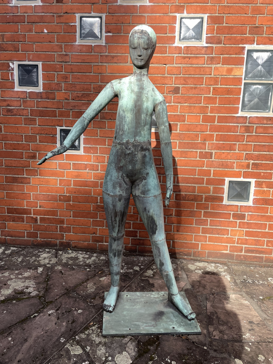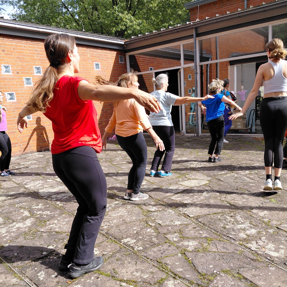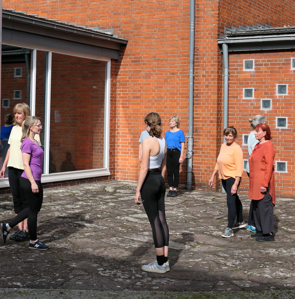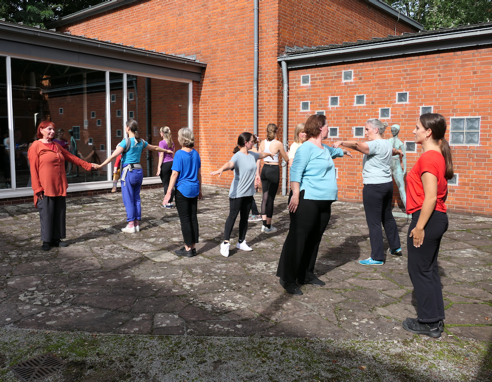 Recht ungewöhnlich war der Ort des Geschehens beim Sommerfest, denn getanzt wurde im Innenhof des Grimme-Instituts! Umrahmt von Skulpturen und den Mauern des denkmalgeschützten Gebäudes präsentierten die Tänzerinnen das Intro sowie vier der 52 Tanzfiguren des Stückes. Besonders sehenswert: ein „Junges Mädchen“, das am Rande des Geschehens durchgehend in seiner Position verharrte, quasi einer Ruhe-Geste aus der Tanzfigur Hug. Schon 1955 war sie aus Kupfer gegossen worden, vom KünstlerJoseph Jaekel.